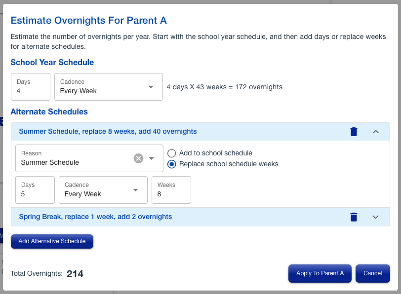 Manually calculating overnights across school years and holidays is often complex and prone to error. The application includes a dedicated estimator that allows users to build a realistic annual schedule. By defining a base school-year cadence and adding or replacing weeks for summer breaks, spring breaks, and holidays, the system automatically totals the overnights for the year. This provides a precise figure for the child support worksheet while creating a clear record of the parenting time assumptions used.