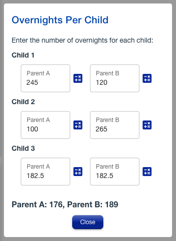 The application allows for the entry of specific visitation schedules for each child. When schedules vary between siblings, the system automatically calculates the average number of overnights and applies that figure to the worksheet.
